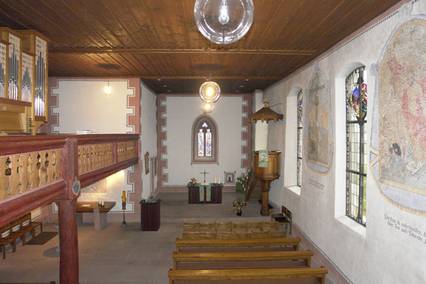 Auf der Südseite des Kirchenschiffes können Sie ein Kreuzigungs- und Auferstehungsfresko von J. Stutz (Liestal) bewundern, die in der zweiten Hälfte des 18. Jahrhunderts gemalt wurden. Die überstrichenen Wandbilder wurden bei der Renovierung der Kirche 1978 bis 1980 restauriert.